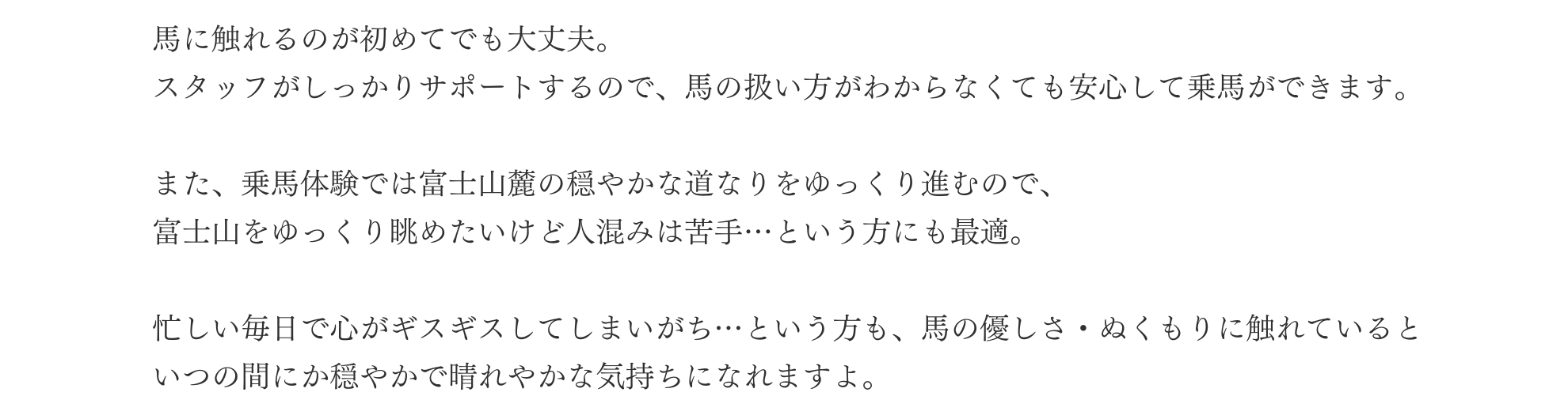 初めて馬と触れ合う方も大歓迎!富士山の絶景を見ながら馬に癒される乗馬体験